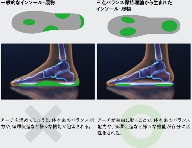 B-TRとSTREは、三点バランス保持理論に基づき開発されました。足裏の三支点(拇趾球・小趾球・かかと)の位置を高くし、足裏から体の土台をつくって足首を支え、身体バランスの要となる骨盤を安定させます。すると、上体まで自然とまっすぐ姿勢が整います。また、足裏にできる隙間が3つのアーチの働きを活性化。体が持つ運動能力や美しさを引き出し、健康づくりをサポートします。一生、自分の足で歩き続けることができる健康な体づくりのために、ぜひ、B-TRシリーズ、STREシリーズで足裏から体の土台をつくり、アーチの働きを活性化させてください。